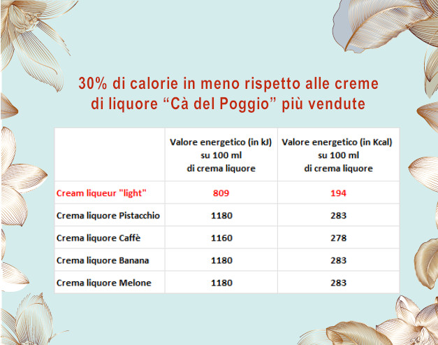 Crema di liquore a base di whisky e panna con il 30% di calorie in meno rispetto alle creme di liquore “Cà del Poggio” più vendute.